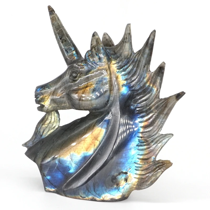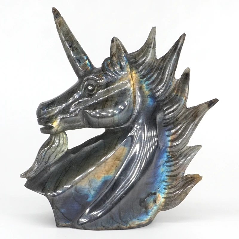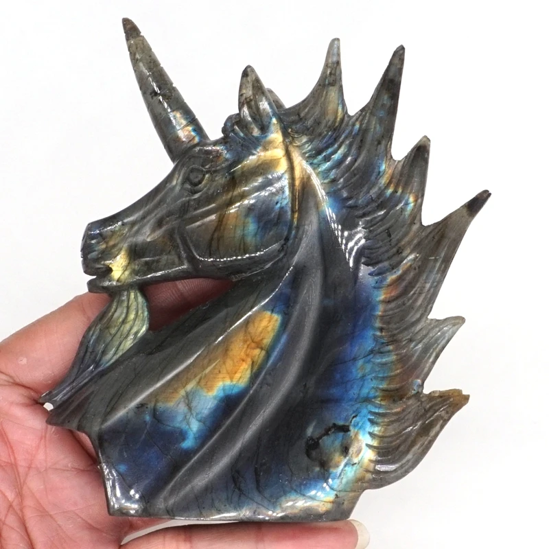 HIGH QUALITY Unicorn Head Figurine Natural Gemstone Labradorite Carved Craft Reiki Healing Home Decor 5.1"